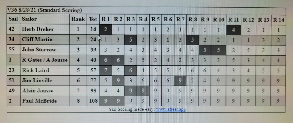 After a crazy start the strong wind let us get 14 races in with Herb D showing us all how it’s done. Cliff M won 4 races but in the end it wasn’t enough.