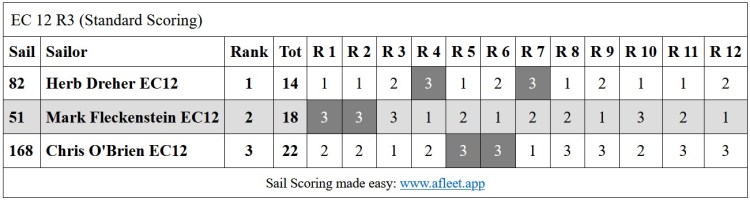 EC-12 R3 and R4 were held today with 3 skippers ( 4th boat scratched due to ripped sail). Herb again takes 1st for both 12 race regattas! Mark Fleckenstein came in second in both regattas with Rick Gates and Chris O’Brien rounding out the field sharing a boat after missing multiple races due to a sheet failure. Conditions were less than ideal with weed patches peppering the modified course. Winds, although rather light, were fairly steady but shifty. Wind shifts were a deciding factor in several heats, making for interesting spectating.