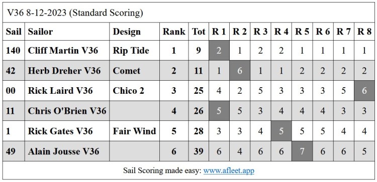 With very light and at times non-existent breeze, the racing started. After a dead boat retrieval just before the first race, racing commenced 20 minutes late. The breeze just got worse with the first 2 races taking 30 minutes each, including 2 boats stuck together, then the next 4 pushed us until 2:20. After the break, the wind got worse and we called it after 8 races. 3 rescues with the club kayak “Breaking Wind” were accomplished. Although the racing was slow and frustrating, to everyone’s surprise there were almost no fouls all day.