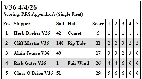 Not a very auspicious start to the season but we tried. Winds, as opposed to most of last year, were in the 10 to 15 knot range- which were a challenge all afternoon. Trouble started even before the first countdown as Rick G had to go home to get a different boat, delaying the start by several minutes. First race Chris got to the first mark and wasn’t able to tack to the second mark. While making adjustments on the shore, his rudder took a hit and cracked and one of his chainplates pulled out. One down. Second race Rick G’s boat just kept falling behind and his boat’s freeboard was slowly decreasing ( it doesn’t have much to begin with actually). Boat taking on water… retired for the day. Two down. Races three and four were fine. Herb dominating throughout. Race five. Alain demasted just after rounding the first mark. Three down. Not wanting to launch the kayak, Cliff and Herb worked at shepherding it toward shore, during which Cliff’s boat’s jib sheet parted somewhere deep in the hull. Four down. That left Herb with the only boat left AND with five bullets to his credit. Racing was suspended at that point.
